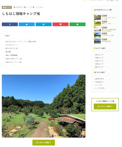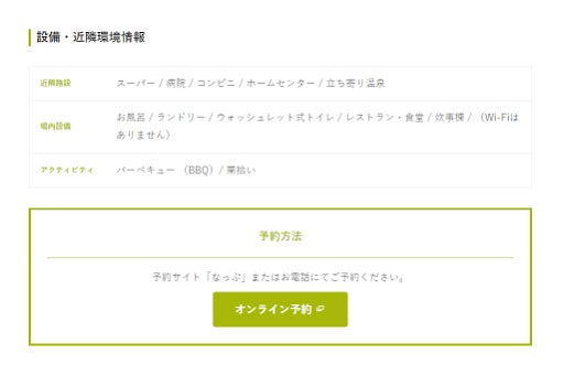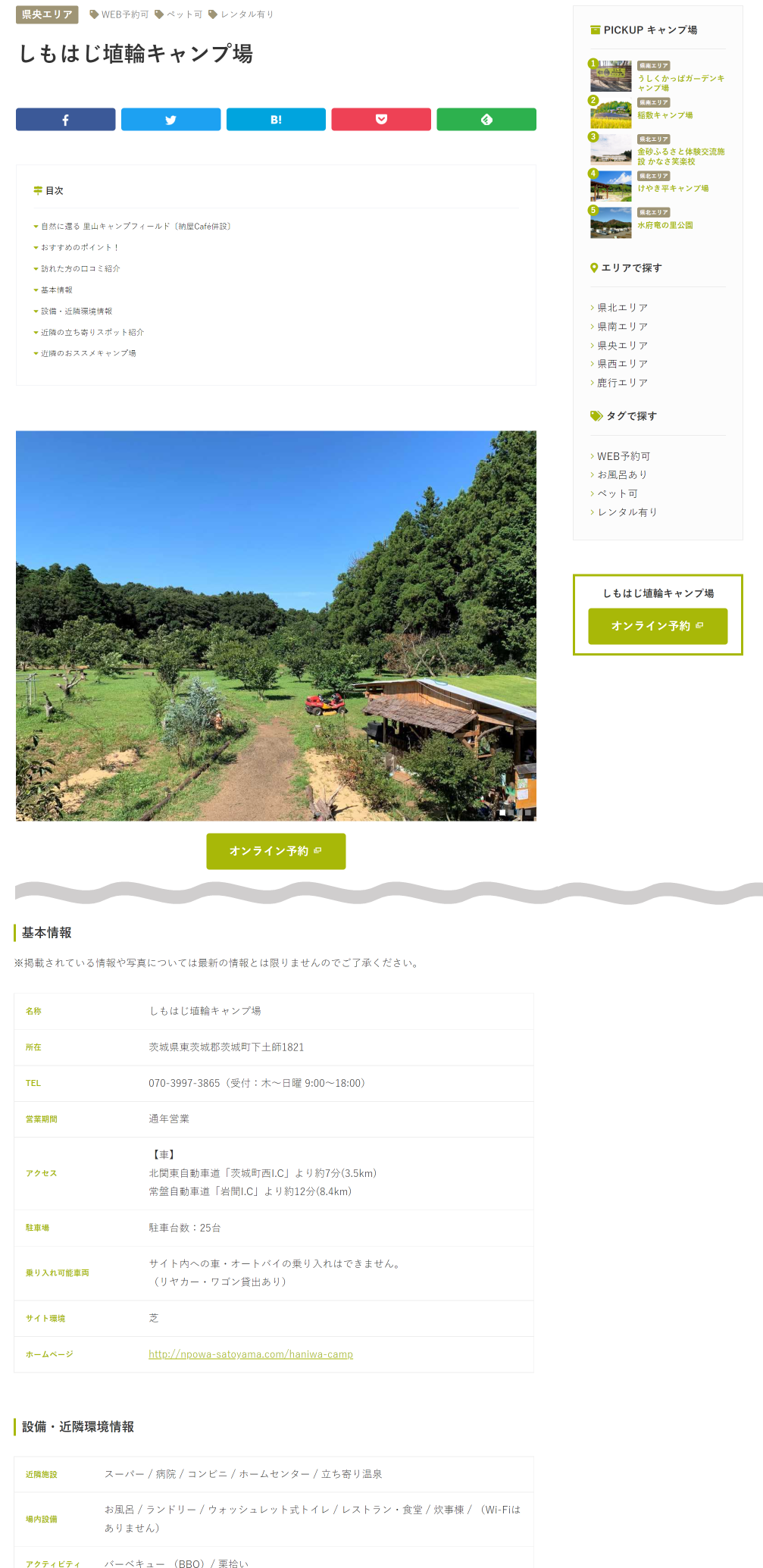サイト内のキャンプ場個別ページには、予約(オンラインまたは電話)への導線を設置し、情報収集から予約まで一気通貫できる仕組みを構築しました。