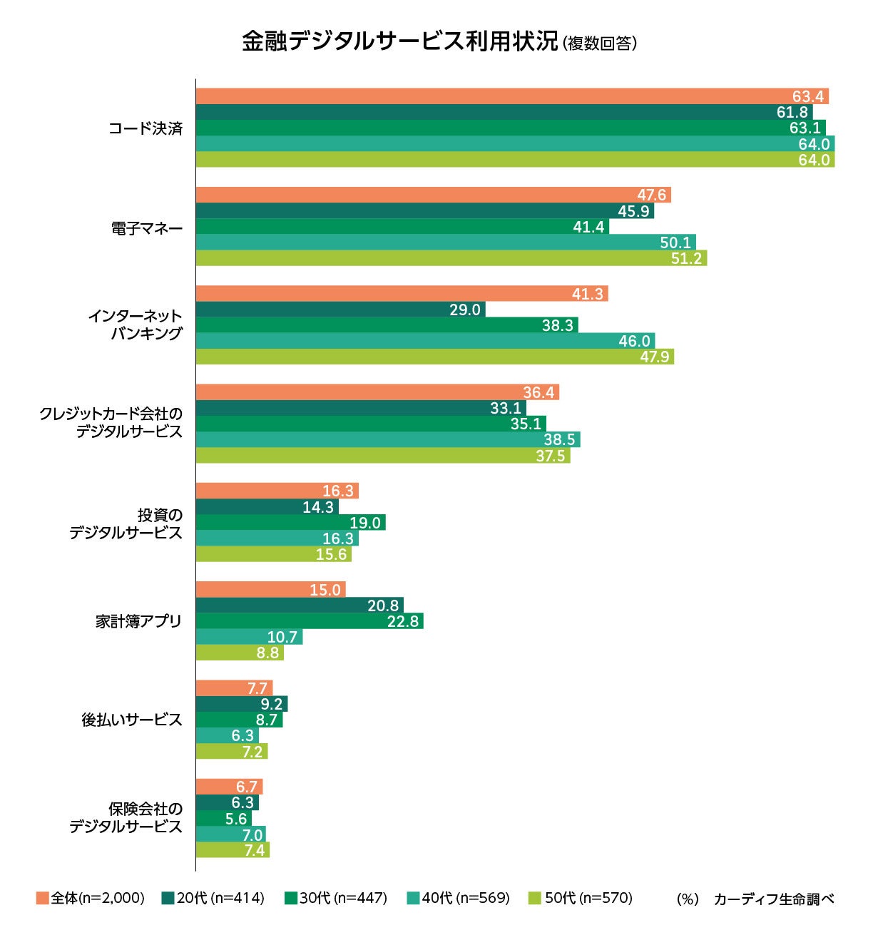 全世代において、金融デジタルサービスの利用が浸透している。利用率トップのサービスは「コード決済」(63%)。「電子マネー」(48%)を超える結果となった(図表3-1)。