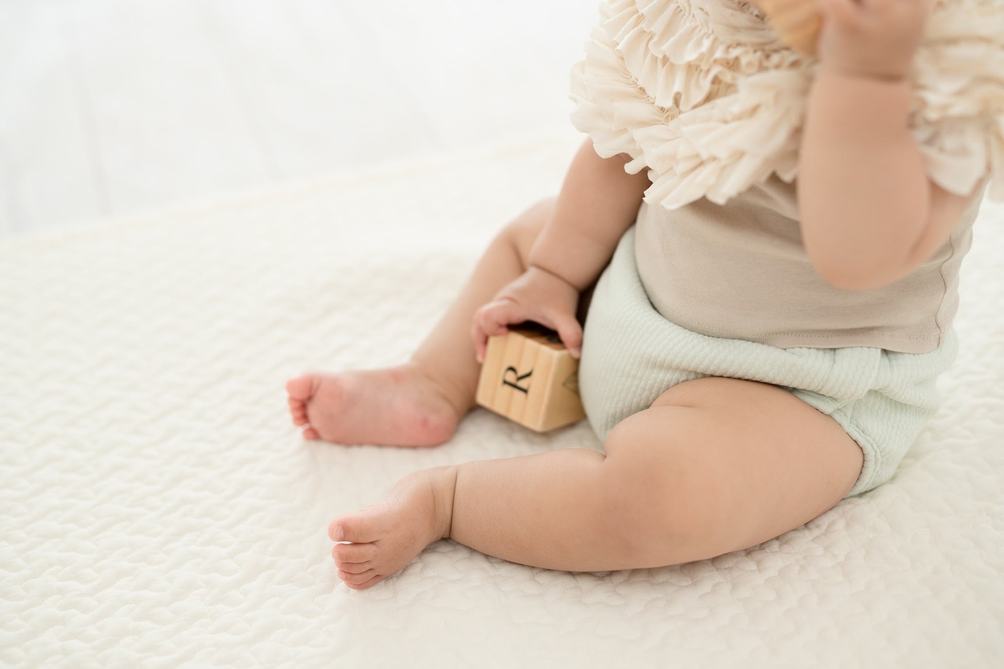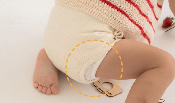 足口には、撥水加工を施した立体ギャザーを採用。柔らかな生地でベビーの動きを妨げず、太ももに優しくフィットします。活発に動いても、おしっこやゆるゆるうんちの横モレを防ぎます。