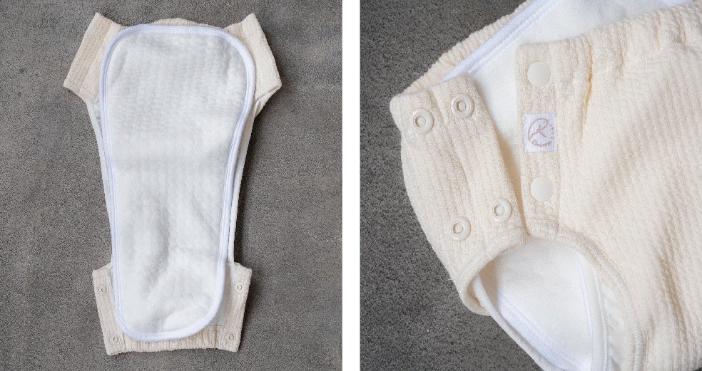 マシュマロおむつは、スナップボタンで簡単に『パンツ型』布おむつに変身。