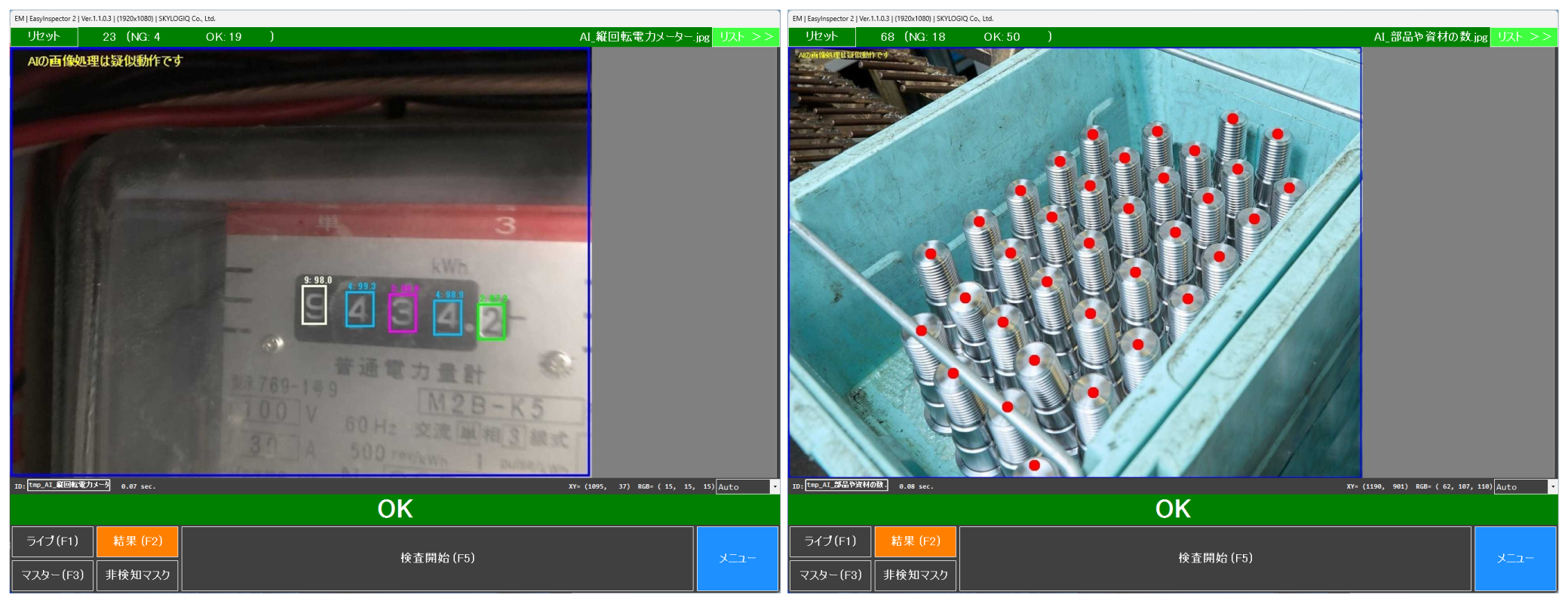 従来の機能で監視が可能であった、メーターアナログメーターや7セグ表示器などの数値の変化や流量計、フロートメーター等の読み取りなどから、さらに監視対象物が増えました。人の目でないと難しいとされていた縦回転電力メーターの読取や金属刻印などの難読文字の読取がAI機能によって可能になりました。また計数機能により、製造現場内での部品や資材を計数し、巡回しなくても在庫確認を行うことが出来ます。