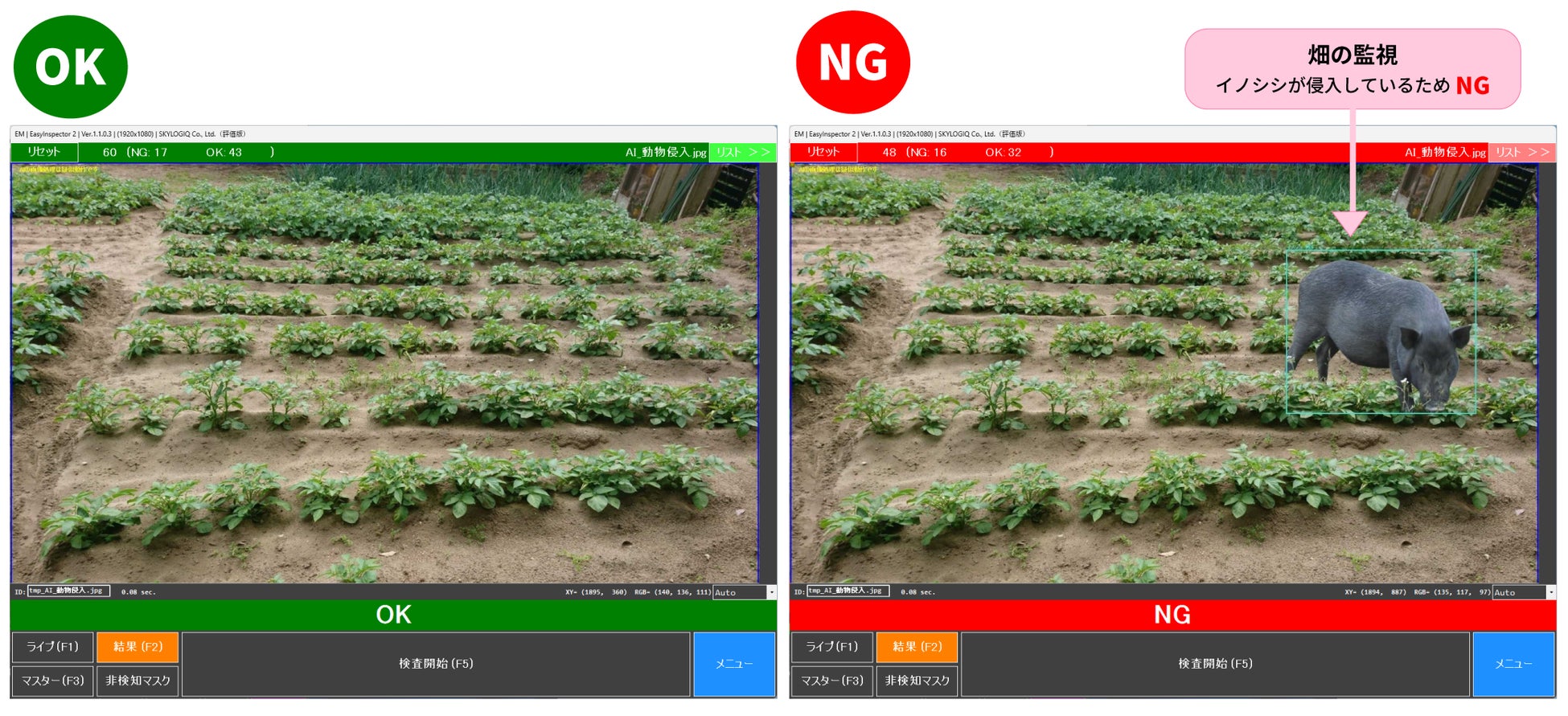 畑を監視し、侵入したイノシシを感知し検出結果を表示しています。