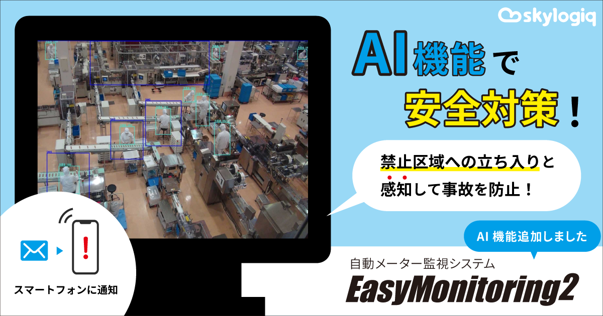 株式会社スカイロジック(本社:浜松市北区、代表:南野真吾)は、目視の巡回確認をカメラと画像処理で自動化する自動メーター監視システムEasyMonitoring2(イージーモニタリング2)にAI機能を追加し、新たにリリースしました。監視したい機器や装置にカメラを付けることで、監視対象物を一定の周期で画像処理し、人間が巡回するように正常/異常の判別や、読み取った値の記録が計器ごとにできます。AI機能により、人や動物などの監視が可能となり、様々な監視対象物や場所、状況下に対応します。今までよりさらに確認による時間と手間の削減に貢献します。