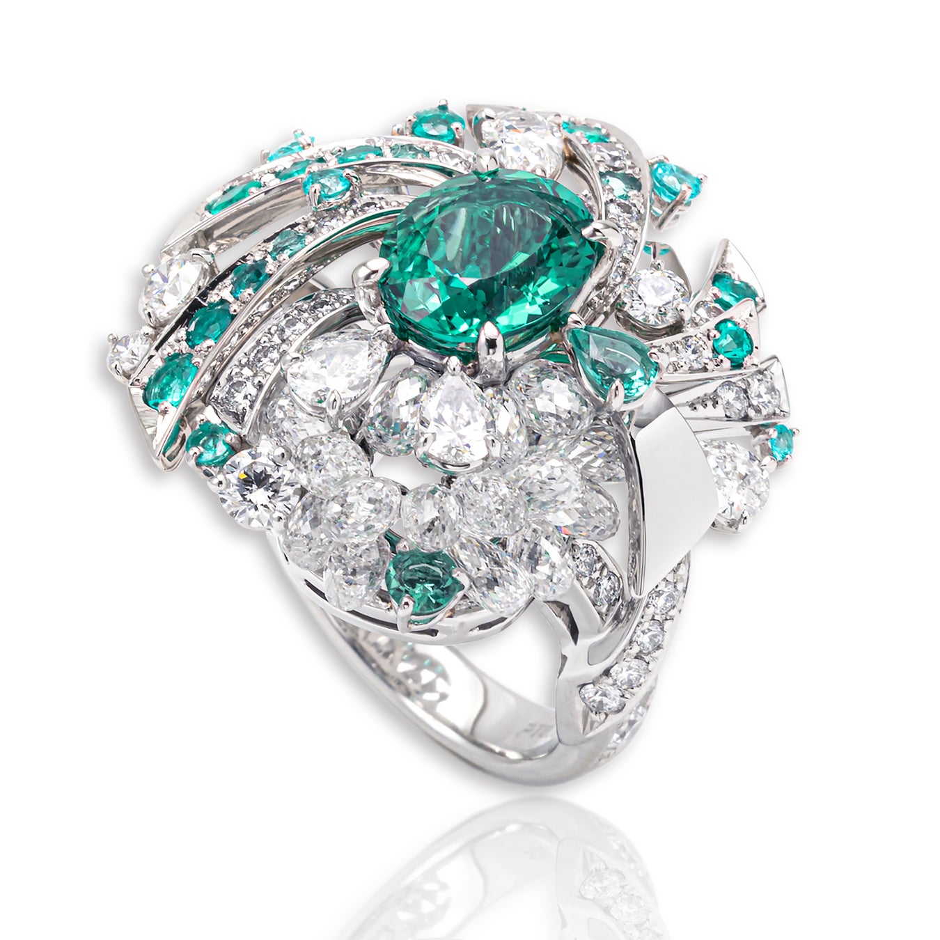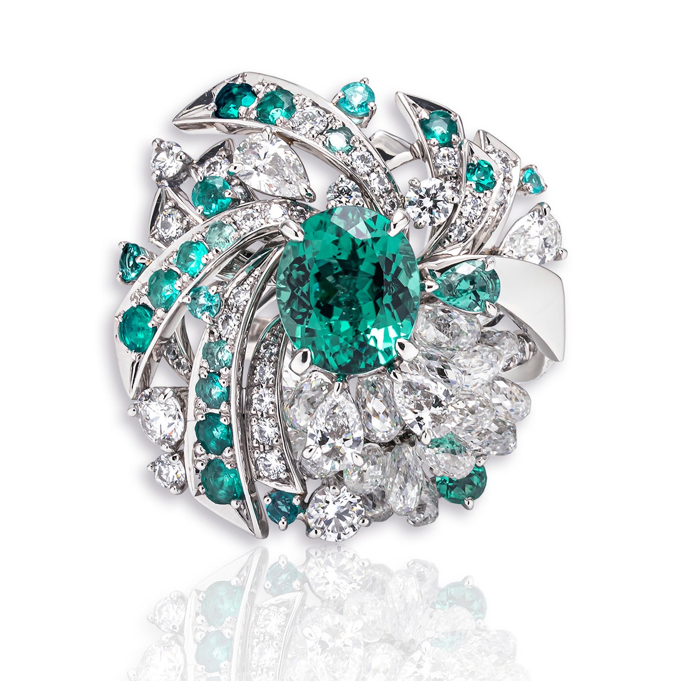 FORM(フォーム)と名付けられたリングは、緻密に設計されたデザインと巧みな技法で仕立てられ、澄みきった海をラグーントルマリン(中石)で表現しています。そのまわりには、風や空に見立てたスパイラル状のラインが取り巻かれている。また、右下部分に、ブリオレットカットのダイヤモンドをセッティングすることにより、まるで朝露の雫のようなダイヤモンドを添えて、五感に訴える神秘的な輝きを放ちます。
