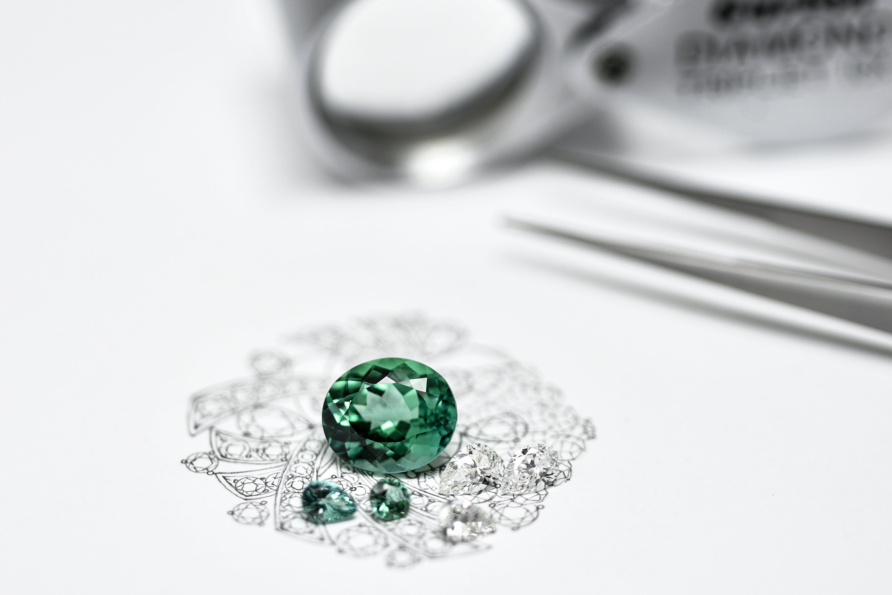デザイナーの審美眼により厳選された高品質な宝石が使われています。色の濃さやテリと呼ばれる光の輝きで包まれた素晴らしいカラーストーンと、ダイヤモンドは数千個の中から厳選した拘りの素材を使用しています。