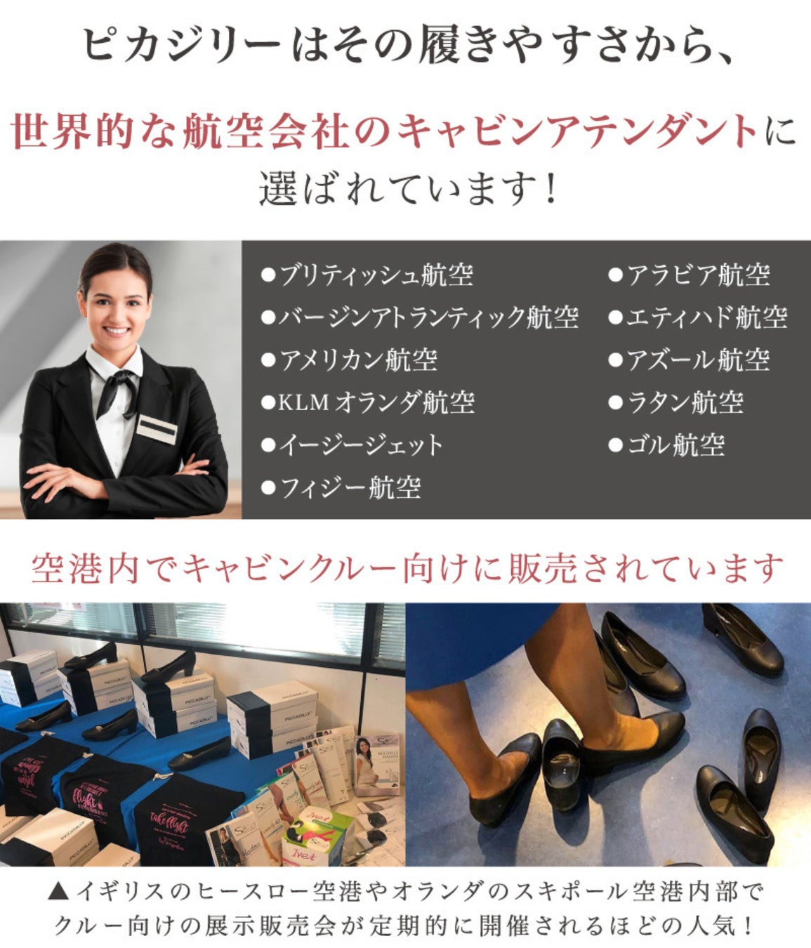 また長時間の立ち仕事や空港内の移動など、日ごろから足を酷使するCAから人気を博し、空港内で空港職員、乗務員用のピカジリーポップアップストアが定期的に開かれるほど人気!