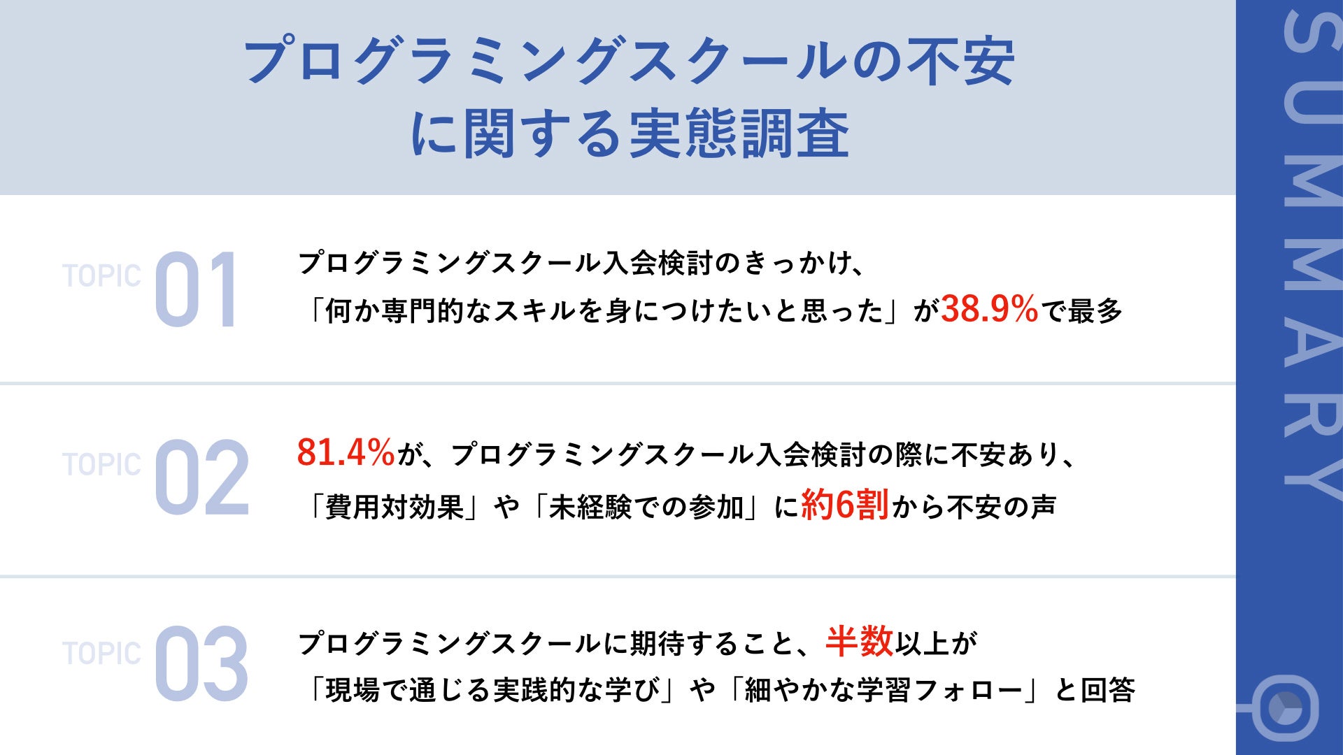 今回の調査では、近年注目されているプログラミングスクールへの入会に関して、さまざまな不安が足かせとなっている実態が浮き彫りとなりました。転職や副業を考える上で、話題となっているWebエンジニアを検討する人が増加しており、プログラミングスクールも増加傾向にありますが、スクールの選択肢が多いことで自分に合うスクール選びも難しくなりつつあります。多くの方がスクール卒業後のキャリアや実践で使えるスキルの習得への不安を解消できるよう、スクール選びにおいて、卒業後のキャリアの充実具合は重要なポイントと言えるのではないでしょうか。