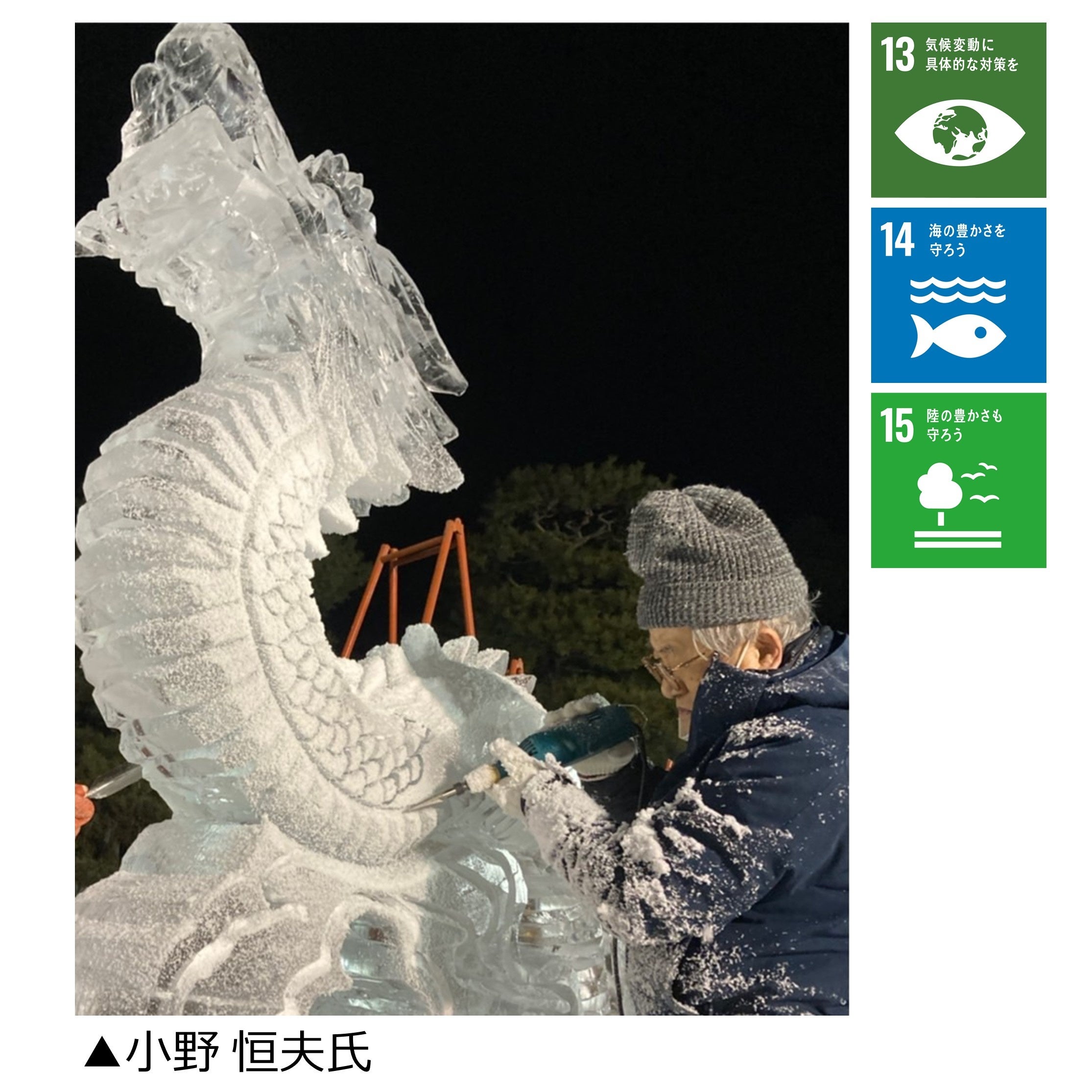 アイスカービングアーティスト小野恒夫氏による迫力満点の実演パフォーマンス。