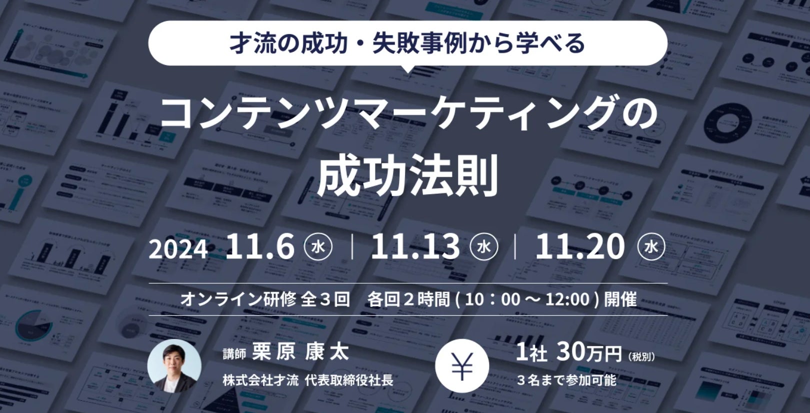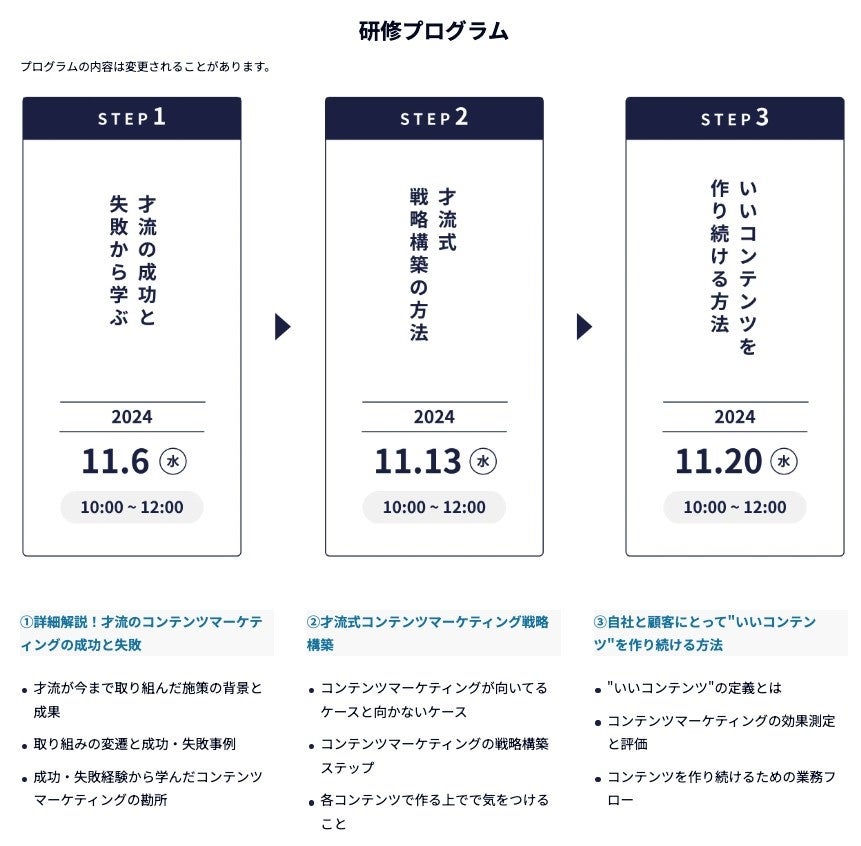 成果が実証された「メソッド」を用いたコンサルティング・研修を提供する株式会社才流(本社:東京都千代田区、代表取締役社長:栗原 康太)は、オンライン研修「コンテンツマーケティングの成功法則」(以下「本研修」)を2024年11月6日から開講、それに伴い研修受講者の受付を開始しました。