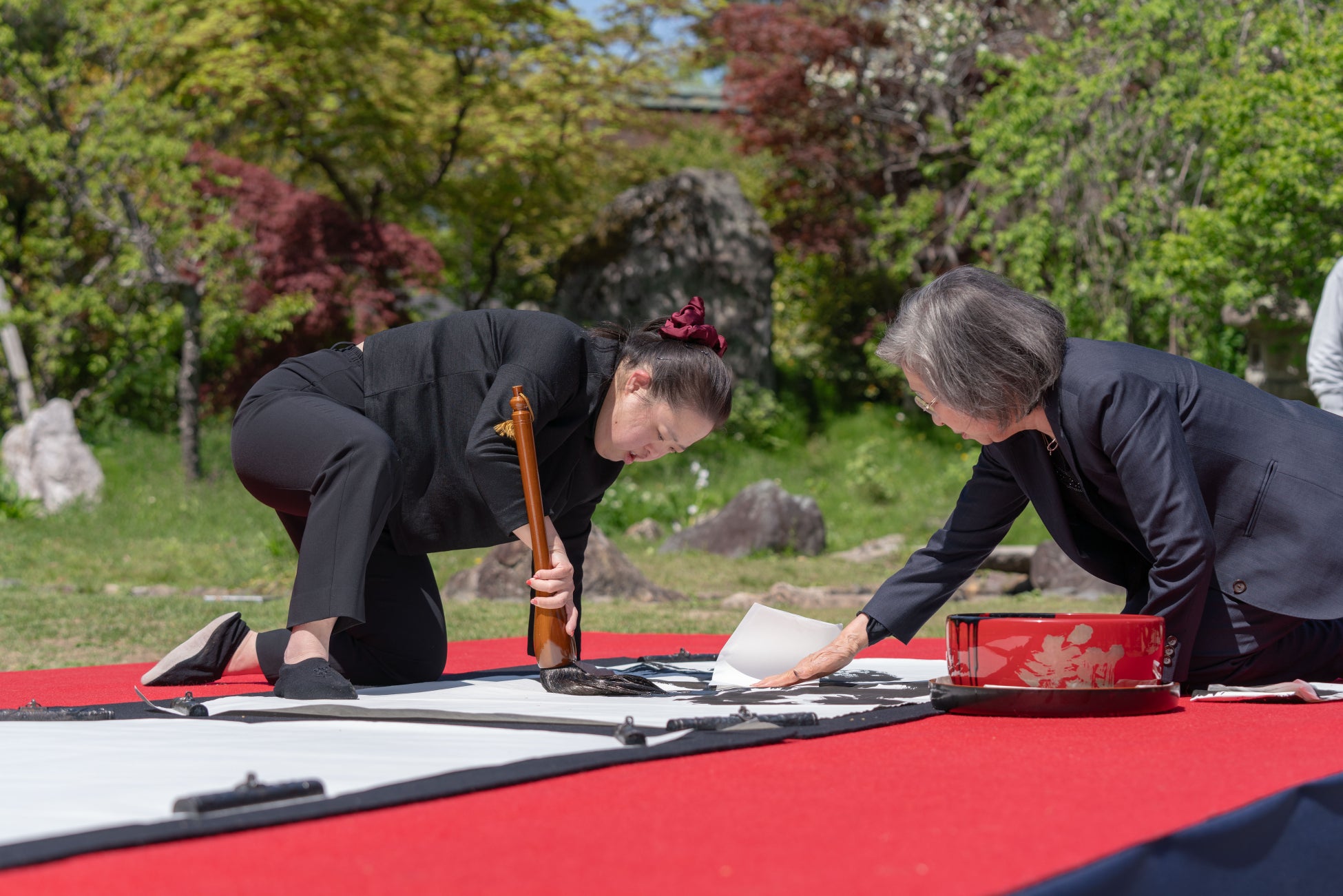 またKINUGASAでの取り組みが社会地域と共存し、空高く舞い上がり大空へ羽ばたくことを祈念して、書家の金澤翔子様による席上揮毫も行われ、「飛翔」をお贈りいただきました。