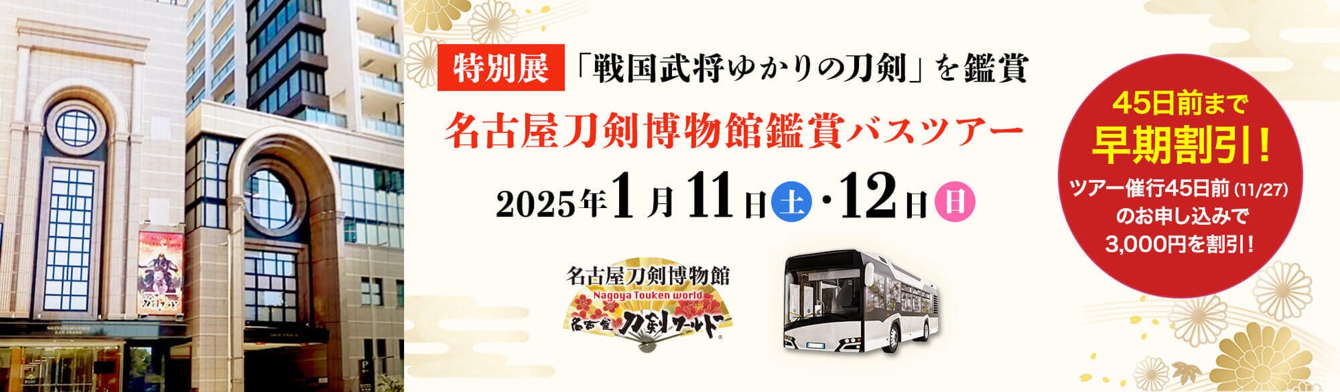 2025年(令和7年)1月11日(土)・12日(日)限定で、特別展「戦国武将ゆかりの刀剣~豊臣秀吉と徳川家康~」を貸し切りで堪能できる1泊2日のバスツアーを催行します。