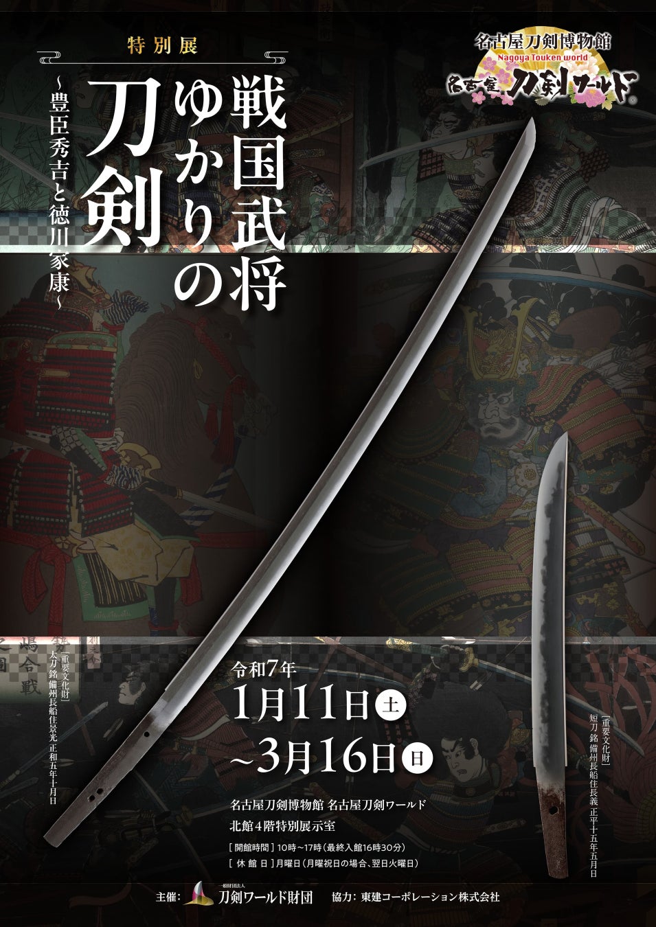 名古屋刀剣博物館「名古屋刀剣ワールド」(以下、当館)では、2025年(令和7年)1月11日(土)から3月16日(日)まで、北館4階特別展示室において、特別展「戦国武将ゆかりの刀剣~豊臣秀吉と徳川家康~」を開催します。