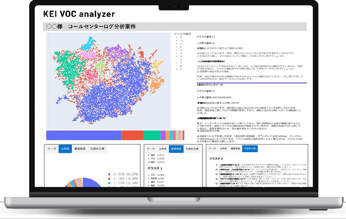 顧客分析プラットフォーム「KEI VoC Analyzer」は、コールセンターなどの大量なテキストデータから必要な情報を抽出したり、傾向を可視化、重要キーワードを抽出したいという企業の課題に対して、顧客の声を理解するための作業を効率化し、詳細に顧客の声を理解することができます。
