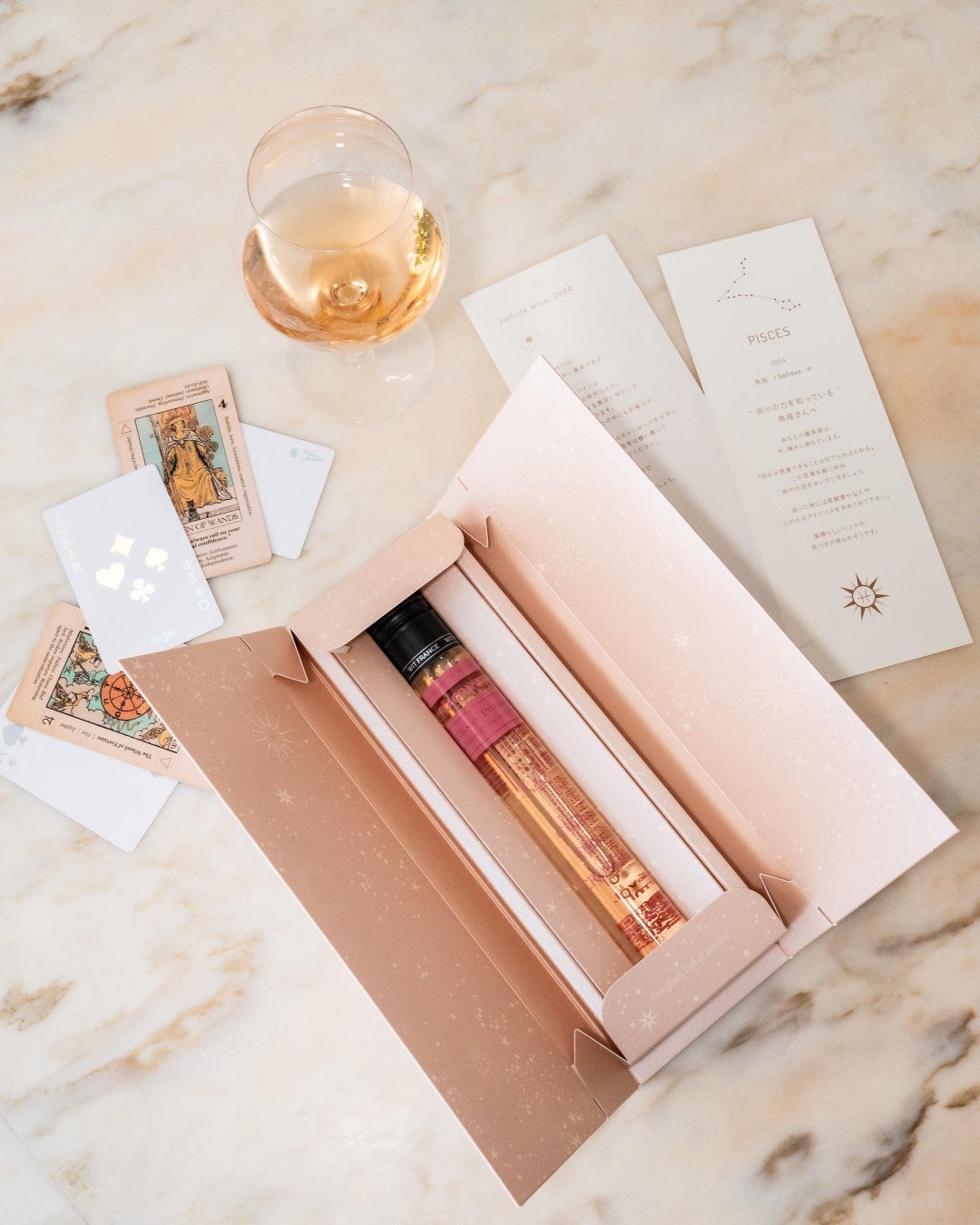 「Fortune Wine 2025」は、2025年の各星座をイメージした1本100mlのワイン/『占星術師 倉徳アーニャ監修』による2025年の運勢メッセージカード/星座モチーフ付きのグラスチャームをセットにした新しいワインギフトです。