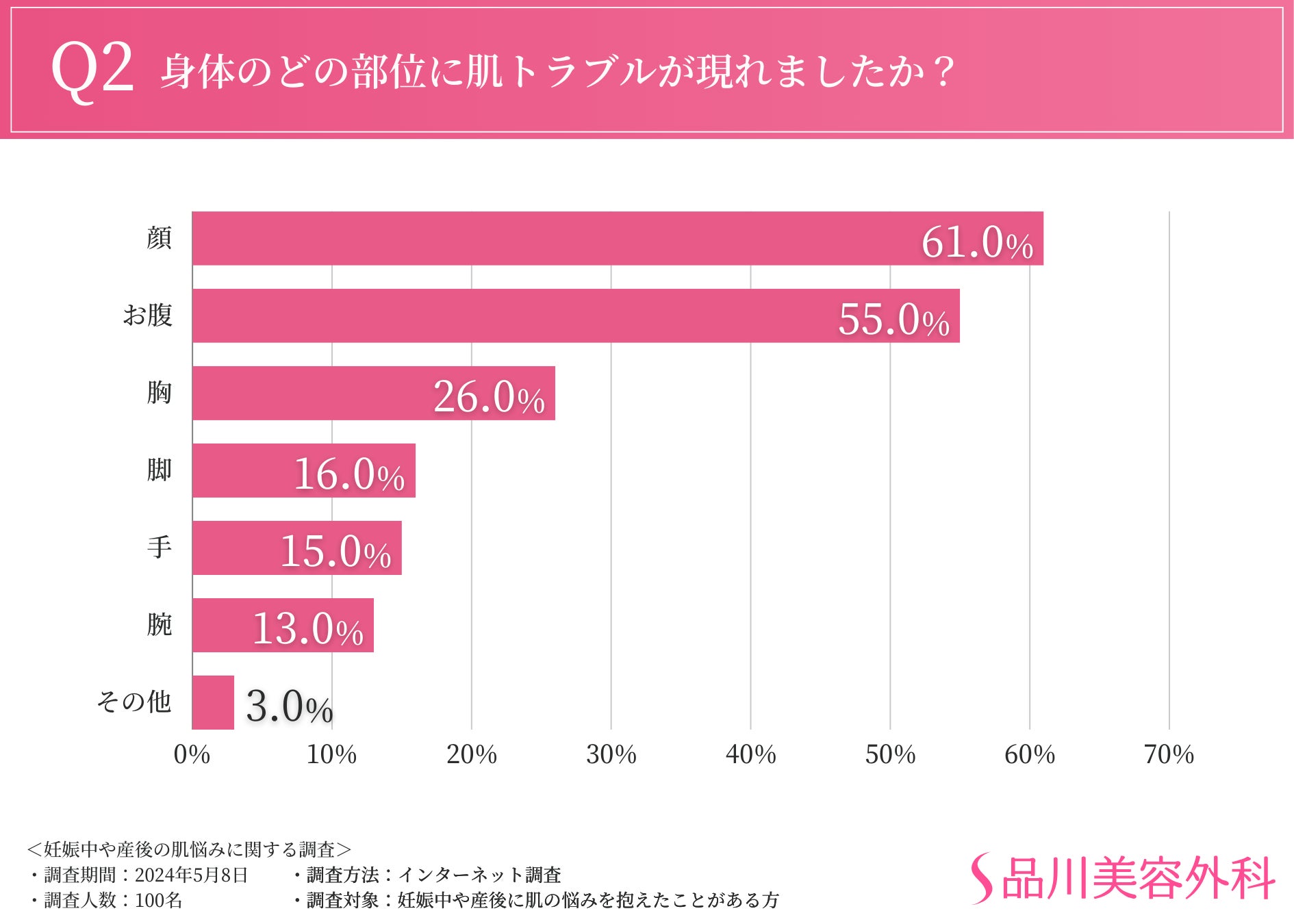 次に、身体のどの部位に肌トラブルが現れたのか伺ったところ、「顔(61.0%)」「お腹(55.0%)」という回答が集まりました。