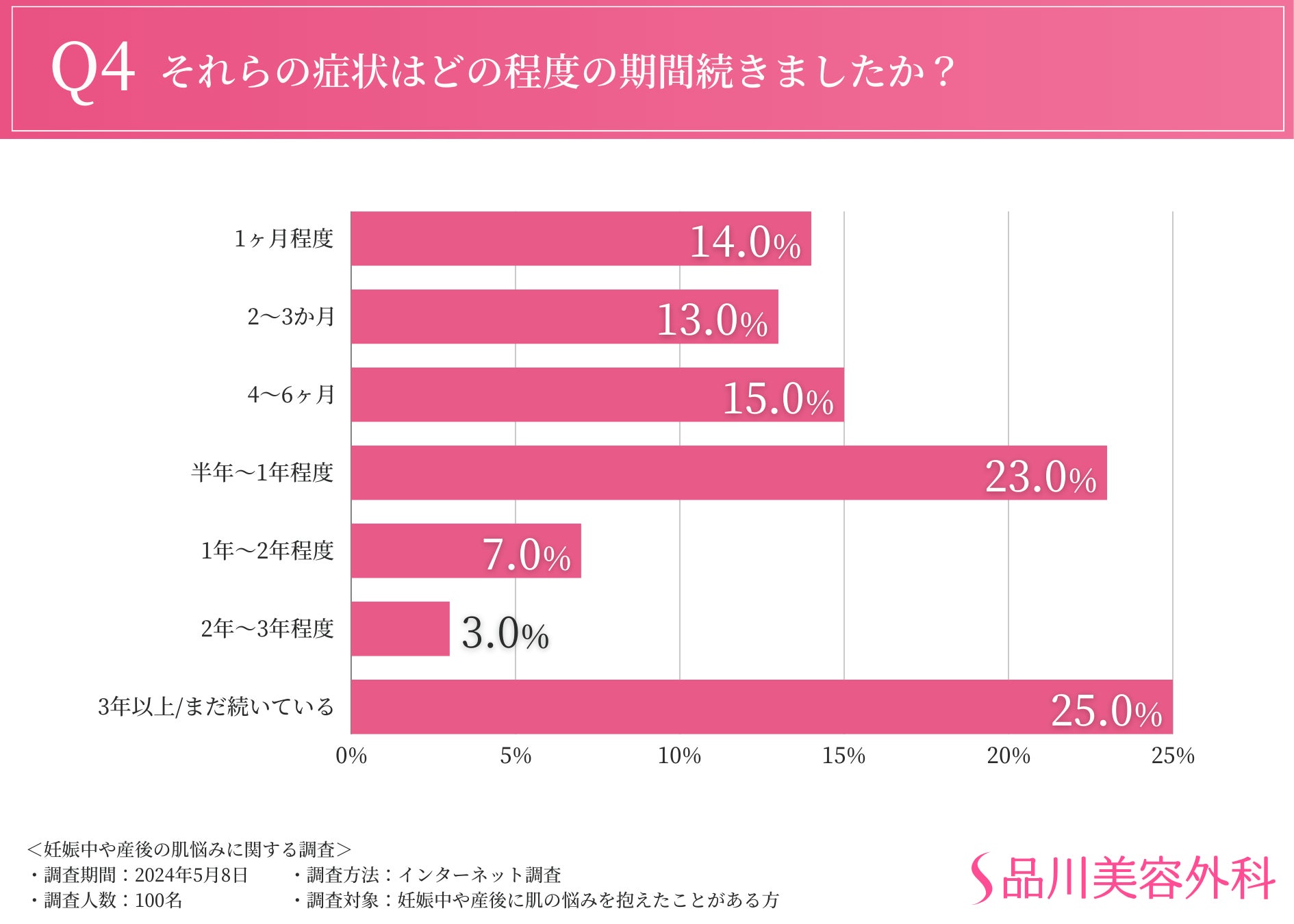 症状を感じたタイミングは産後と回答した方が多く、中には現在も症状が改善しておらず、3年以上も悩まされている方もいることが明らかになりました。