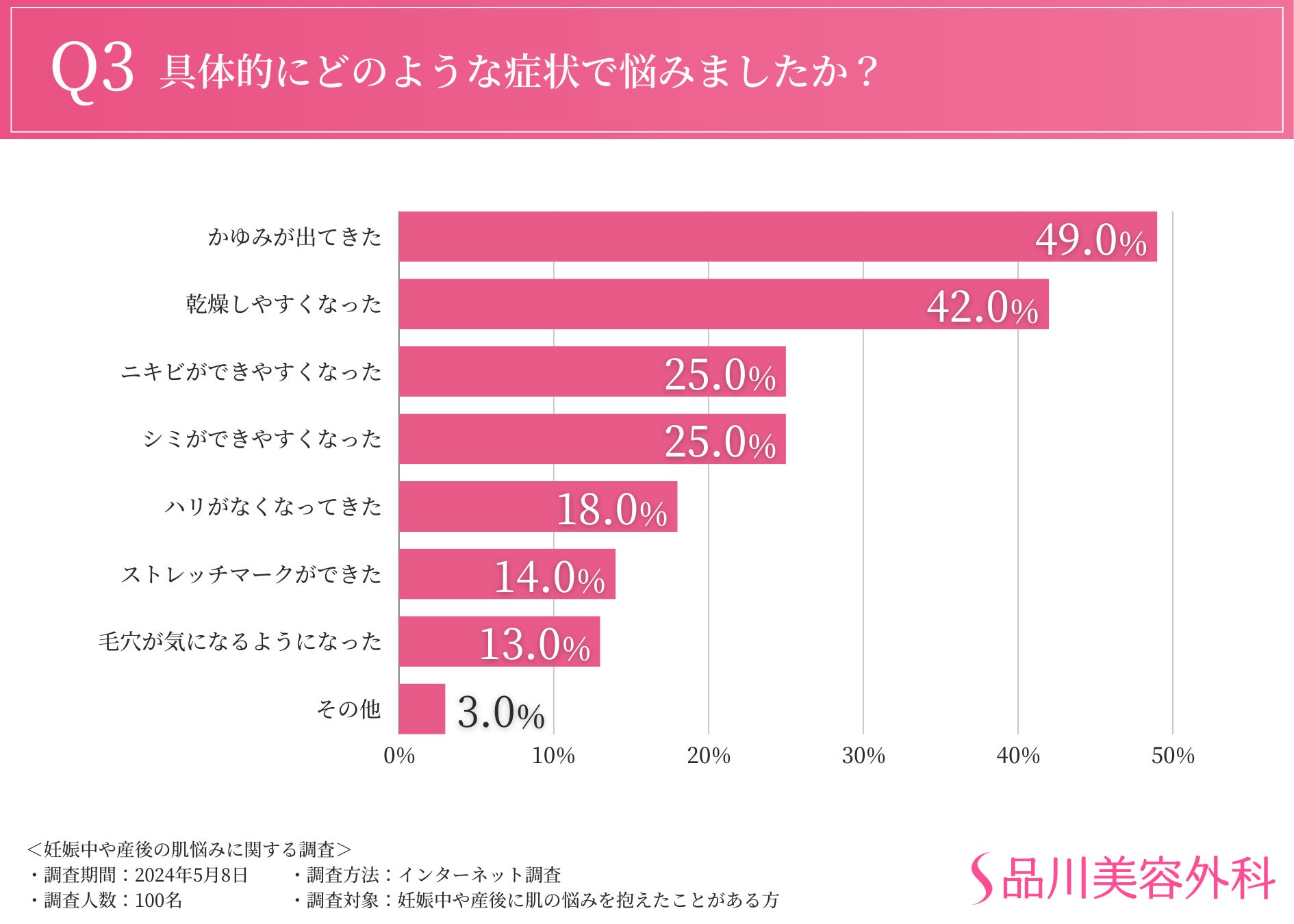 この乾燥は、産後のホルモン低下による影響も大きいので、「乾燥しやすさ」も次に多い症状として回答が集まりました。