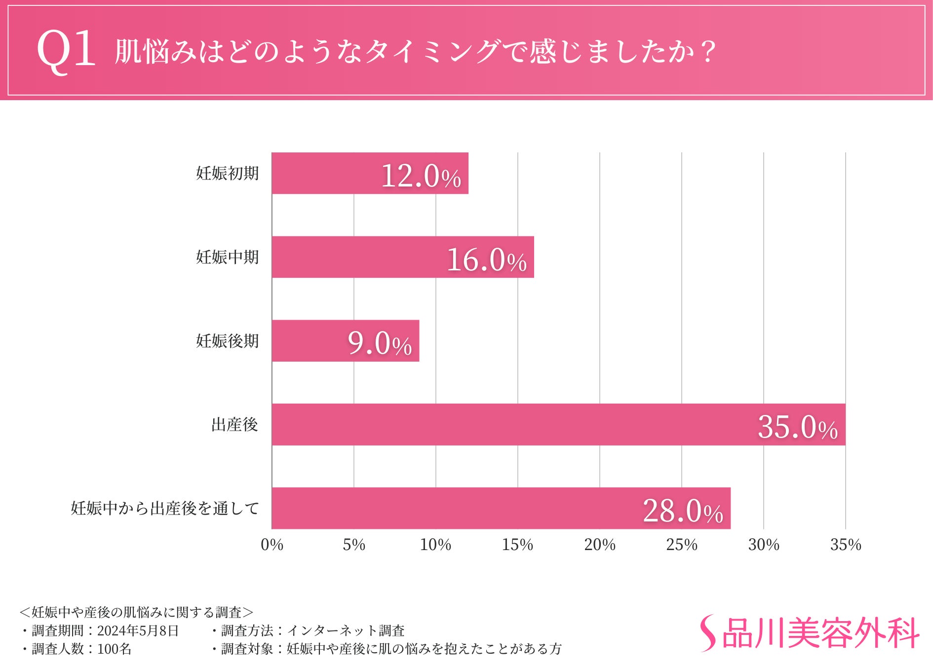 はじめに、肌悩みはどのようなタイミングで感じたのか伺ったところ、「出産後(35.0%)」「妊娠中から出産後を通して(28.0%)」という回答が集まりました。