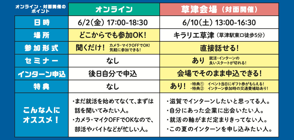 『滋賀インターンフェス』では、学業やアルバイトなどに合わせて学生が好きなスタイルで参加できるよう、オンライン・対面の2日間にて開催します。
