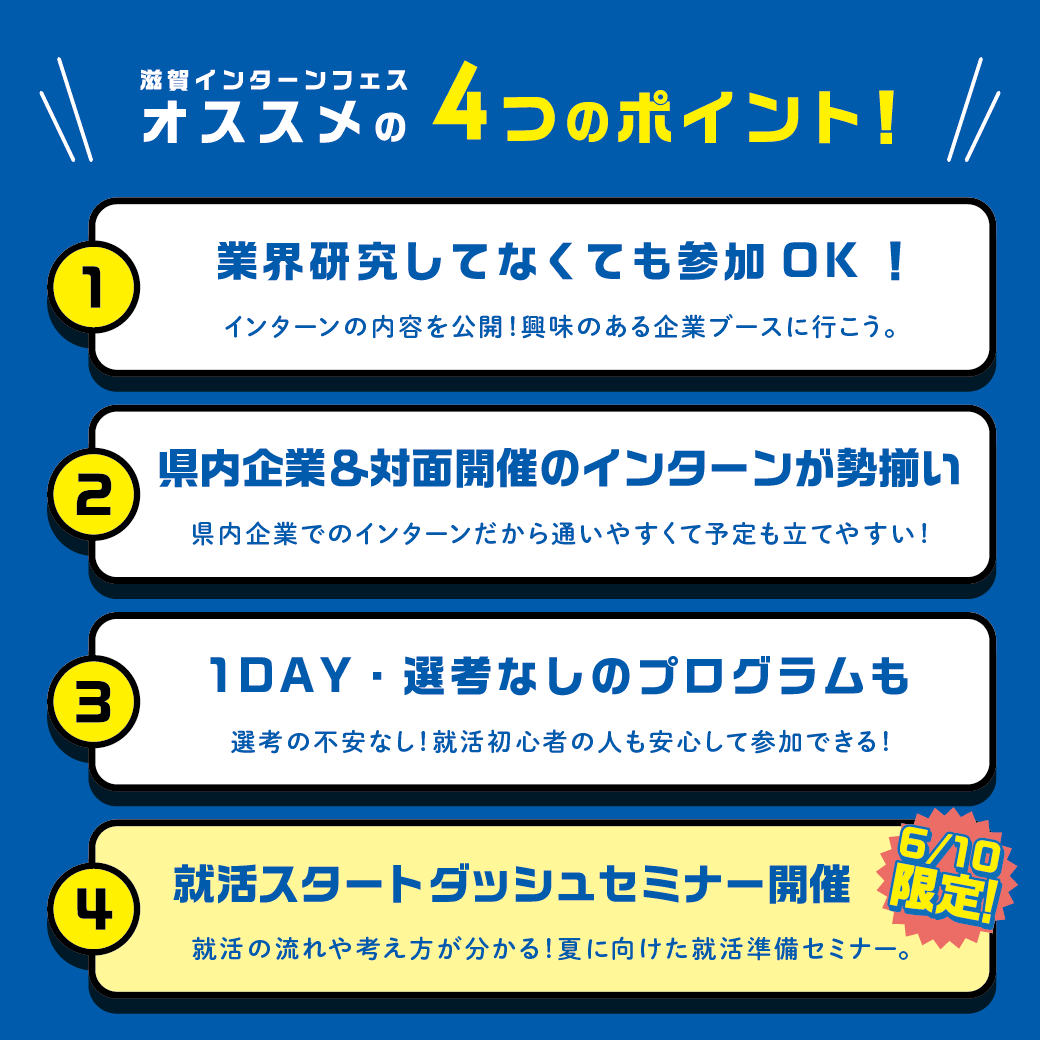 〜今夏、滋賀県内で実施されるインターンシップ・1DAYお仕事体験の情報が集結。業界研究をしていなくても参加できる、1回生〜3回生向けに特化したプレ就活イベント〜