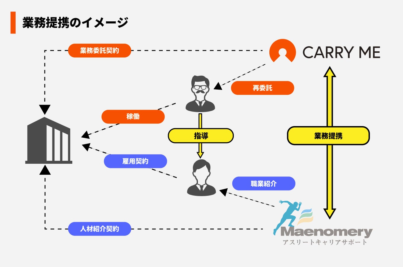 今回の業務提携では、専門的知見が必要な業務の遂行に課題を抱えている企業様に対し、マエノメリからはアスリート人材を、キャリーミーからはプロ人材をご紹介します。企業はプロ人材を活用して事業を成長させることに加え、専門性の高い分野を内製化すると共に、アスリート人材のポテンシャル採用によって企業の採用課題の解決に取り組むことができます。