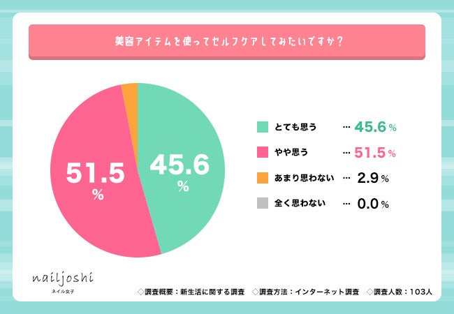 次に「美容アイテムを使ってセルフケアしてみたいですか?」という質問に対し、「やや思う」と回答した方が51.5%と最も多く、次いで「とても思う」が45.6%という結果になりました。「やや思う」「とても思う」を合わせると97.1%となり、9割を超える方がセルフケアに意欲を示していることがわかります。