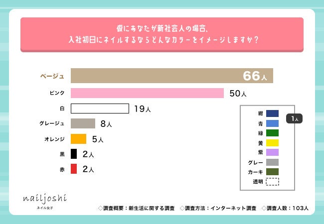 仮に新社会人として入社初日にするネイルカラーは「ベージュ」(66人)が圧倒的多数、次いで「ピンク」(50人)、「白」(19人)の順