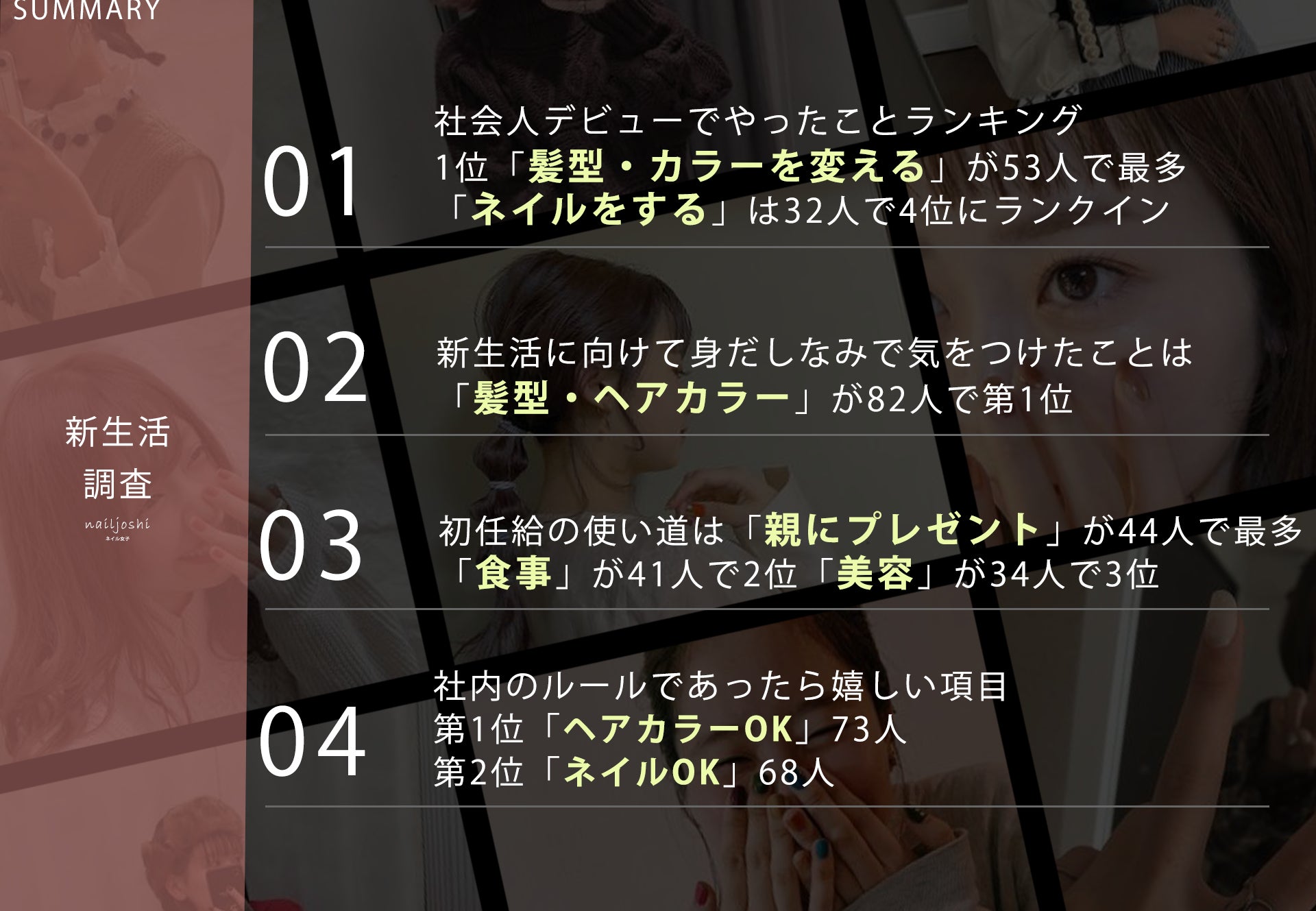 髪や化粧品ほどではありませんでしたが、ネイルも各設問で多くの票を獲得しており、新社会人でネイルを望む、また力を入れたいという様子がうかがえました。ネイル禁止の職場が多いことが影響し、髪や化粧品ほど票を獲得できていなかった可能性も考えられます。