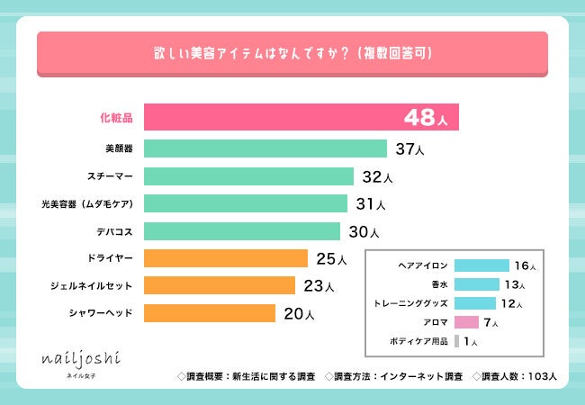 また、7位には「ジェルネイルセット」(23人)がランクイン。自宅でプロ並みのネイルケアを楽しめるジェルネイルセットは、初任給で自己投資したいアイテムとして人気を集めているようです。