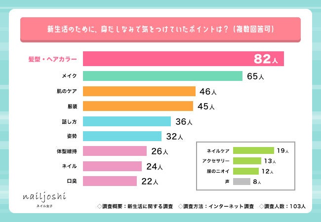 新生活に向けて身だしなみで気をつけたのは「髪型・ヘアカラー」(82人)が最多