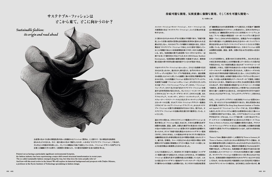 全産業のなかでも特に環境負荷が高いと指摘されるファッション業界は、ここ数年で一気に構造的な転換を迫られたように見える。その一連の流れのなかで誕生したのが、いわゆる「サステナブル・ファッション」であるが、そもそもこの用語が何を指し示し、そしてこの潮流は今後どう進化していくのか。ファッションデザインを専門とする京都工芸繊維大学の水野大二郎教授の寄稿により、その歴史的経緯や未来の道程を考える。