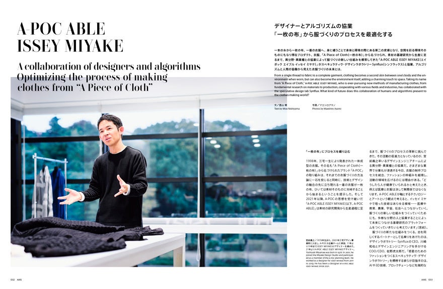 一本の糸から一枚の布、一着の衣服へ。身に纏うことで身体と環境の間にある第二の皮膚となり、空間を彩る環境そのものにもなり得るプロダクト、衣服。「A Piece of Cloth(一枚の布)」から名づけられ、素材の基礎研究から生産に至るまで、異分野・異業種との協業によって服づくりの新しい仕組みを模索してきた「A-POC ABLE ISSEY MIYAKE(エイ ポック エイブル イッセイ ミヤケ)」がスペキュラティヴ・デザインラボラトリーSynflux(シンフラックス)と協業。アルゴリ ズムと人間の協働から見えた衣服づくりの未来とは。