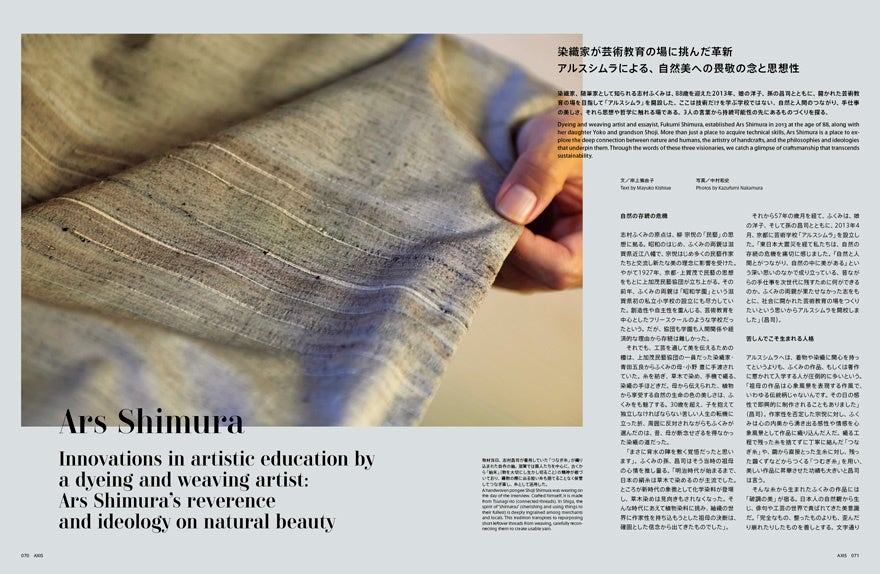 染織家、随筆家として知られる志村ふくみは、88歳を迎えた2013年、娘の洋子、孫の昌司とともに、開かれた芸術教育の場を目指して「アルスシムラ」を開設した。ここは技術だけを学ぶ学校ではない。自然と人間のつながり、手仕事の美しさ、それら思想や哲学に触れる場である。3人の言葉から持続可能性の先にあるものづくりを探る。