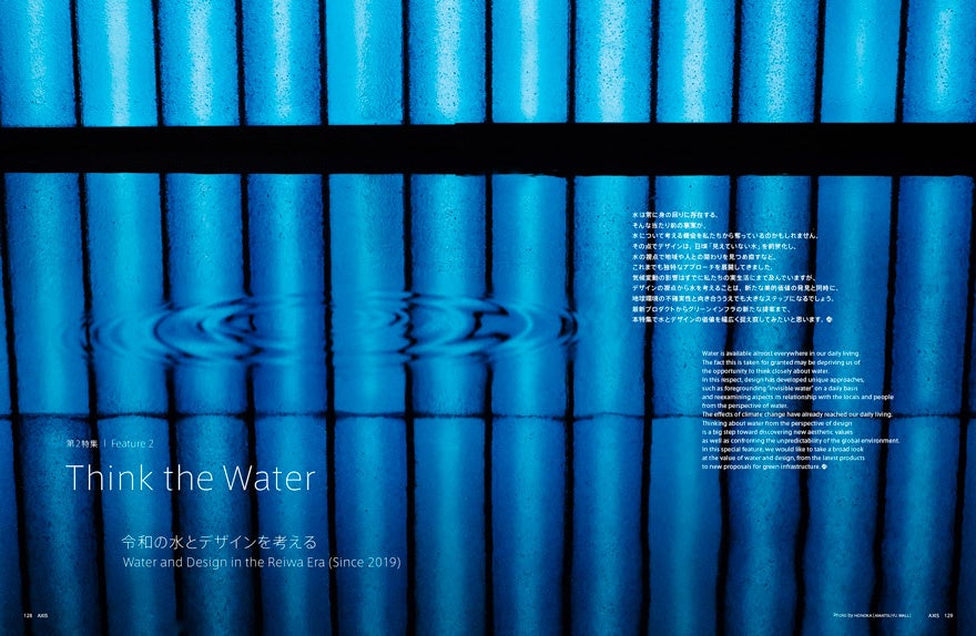 水は常に身の回りに存在する。そんな当たり前の事実が、水について考える機会を私たちから奪っているのかもしれません。その点でデザインは、日頃「見えていない水」を前景化し、水の視点で地域や人との関わりを見つめ直すなど、これまでも独特なアプローチを展開してきました。気候変動の影響はすでに私たちの実生活にまで及んでいますが、デザインの視点から水を考えることは、新たな美的価値の発見と同時に、地球環境の不確実性と向き合ううえでも大きなステップになるでしょう。最新プロダクトからグリーンインフラの新たな提案まで、本特集で水とデザインの価値を幅広く捉え直してみたいと思います。