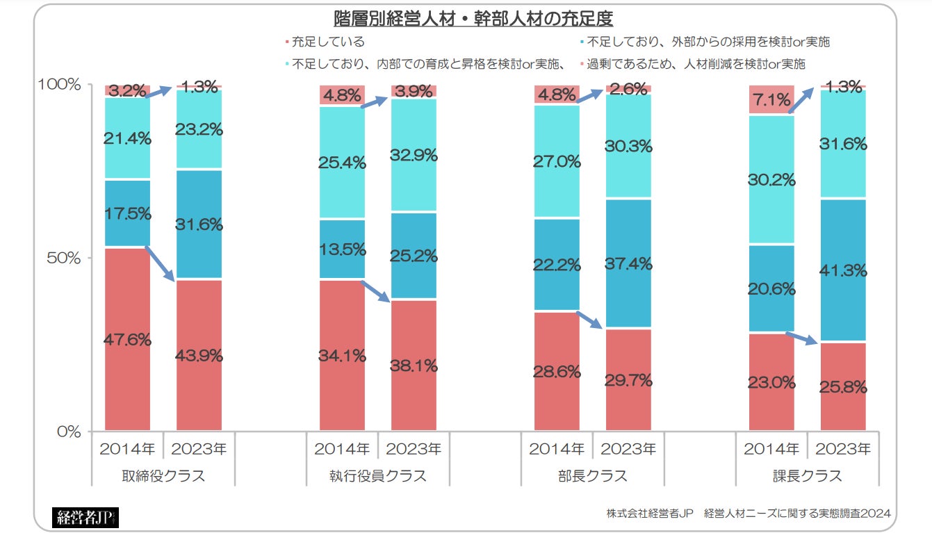2014年の調査結果と比べると、各層で人材が不足している割合が15~20%ほど増え、企業の幹部人材不足が加速していることが明らかになった。