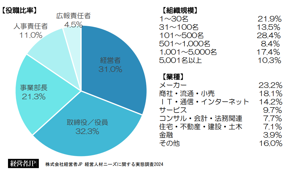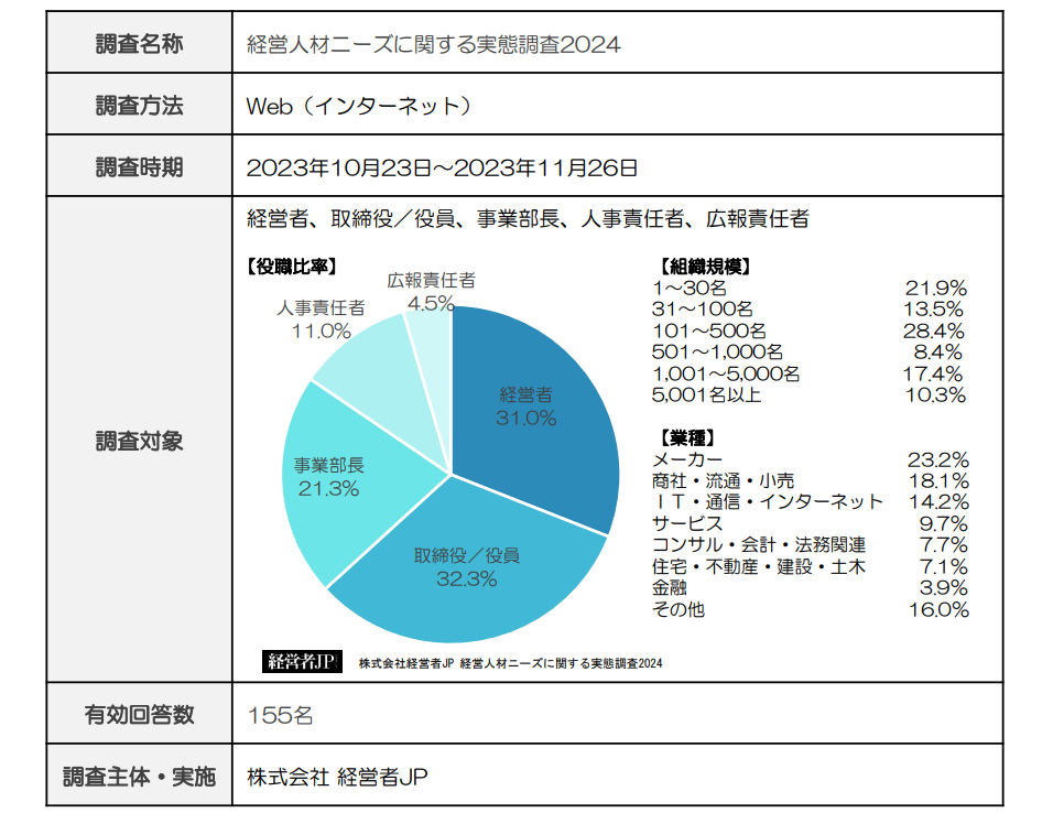そこで、企業が経営人材に関して現状どのようなニーズや課題を抱えているかの調査を実施し、その実態を明らかにすることで企業各社やメディア各社にお役立ていただければと願っております。