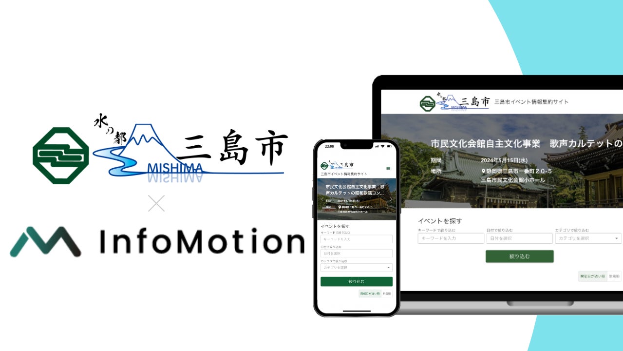 株式会社インフォモーション(本社:東京都目黒区、代表取締役:矢野 祐輔)は2024年4月26日(金)、三島市が、AIによる自動情報収集プログラムを用いたAIイベント情報集約サービス「三島市イベント情報集約サイト」を導入したことをお知らせいたします。