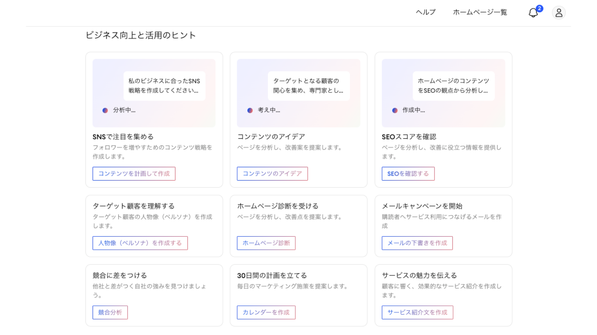 「お客様を増やす具体策がわからない」「本業が忙しく、サイト更新に割ける時間が限られている」という課題に対し、AIがSEOキーワードの最適化や問い合わせボタンの配置改善など、今すぐ取り組めるアクションを提示します。コンテンツ作成のサポートも行うことで、限られた時間でも効率的なホームページ運用とビジネス成長を支援します。