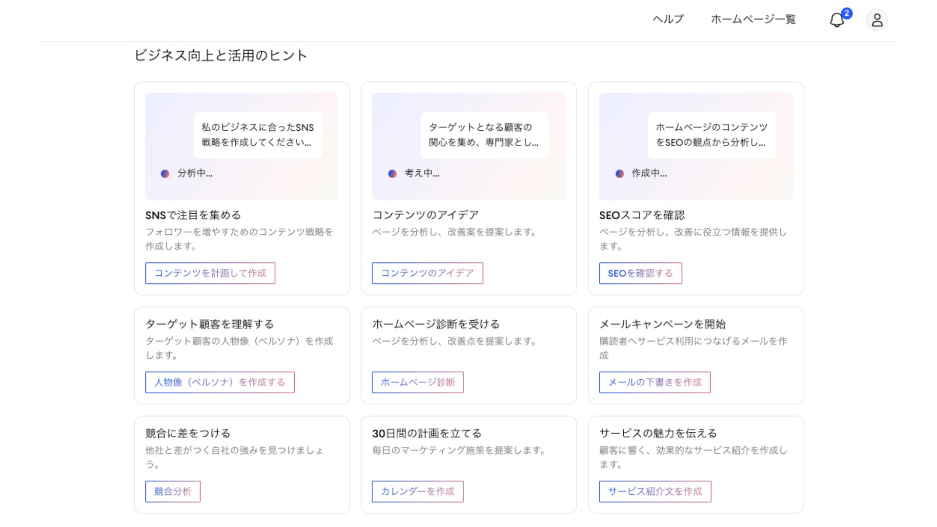 AIが自動でホームページの現状や競合をチェックし、分析データに基づき「次やるべきこと」を提示・提案します。SEO改善、コンテンツ作成のアイデア、SNSフォロワーを増やすための戦略、マーケティングやキャンペーン施策の提案、ペルソナ作成などを含めたビジネス全体の向上を支援し、AIが「何からやるべきか」優先順位をつけてロードマップ化するため、迷わず行動を起こすことができます。