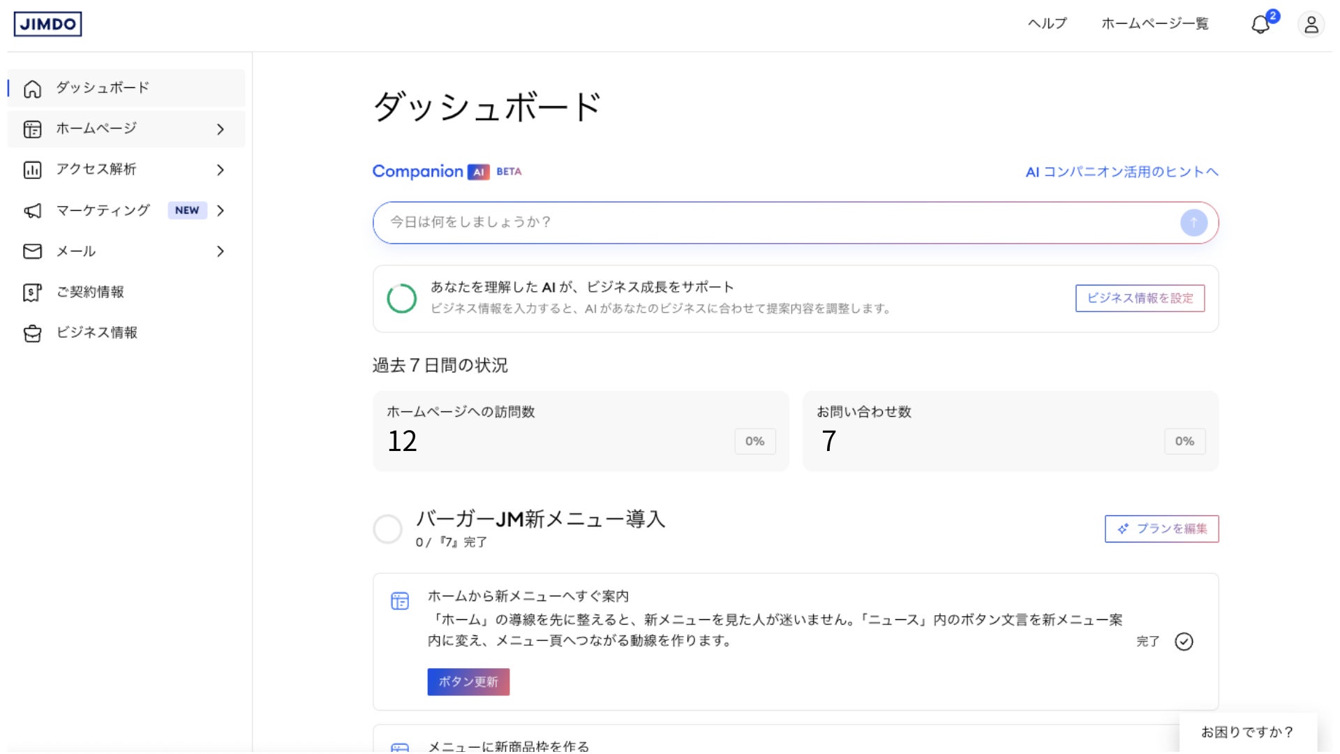 株式会社KDDIウェブコミュニケーションズ(本社:東京都港区、代表取締役社長:石井健太郎)は、ホームページ作成サービス「ジンドゥー(Jimdo)」において、AIが専属ビジネスアドバイザーとしてサイト運用の効率化とビジネス成長を伴走サポートする新機能「AI コンパニオン」を2026年4月20日(月)より提供開始いたしました。