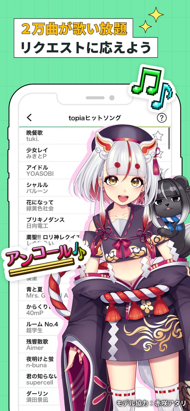 topiaは、毎日2000人以上の個性あふれるVライバーたちが歌配信しているスマートフォンアプリです。Vライバーとリスナー(視聴者)が、コメントやコラボ通話、歌のリクエストを通じて、ゼロ距離のコミュニケーションを一緒に楽しめます。