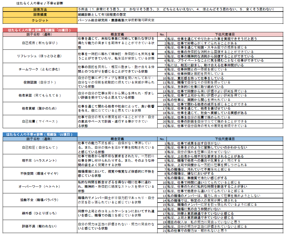 「はたらく⼈の幸せ/不幸せ診断(「パーソル総合研究所+慶⼤前野研究室」)」の42項目を7件法から5件法にアレンジして実装いたします。