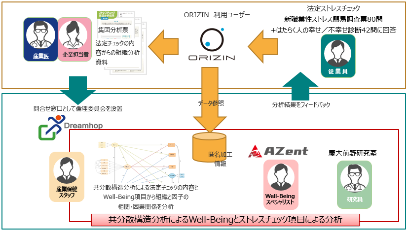 収集されたデータはドリームホップに加え、慶大前野研究室研究員およびAZentの関係者にて、心理的結果についての相関・因果関係分析を行います。