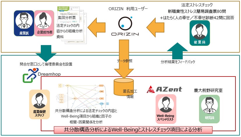 本実証事業はドリームホップの提供する「メンタルヘルスプログラムORIZIN」のストレスチェック機能に42のWell-Being項目を追加し、データの収集を行います。