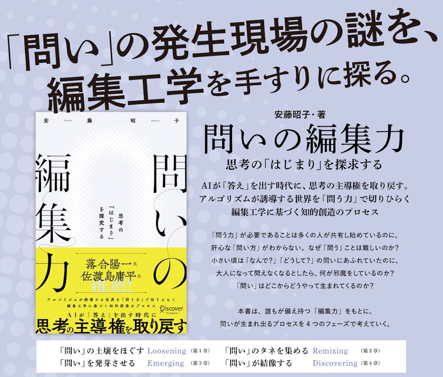 編集工学研究所(本社:東京都世田谷区)の代表取締役社長・安藤昭子による書籍『問いの編集力 思考の「はじまり」を探究する』が9月20日(金)にディスカヴァー・トゥエンティワン社より発売されます。