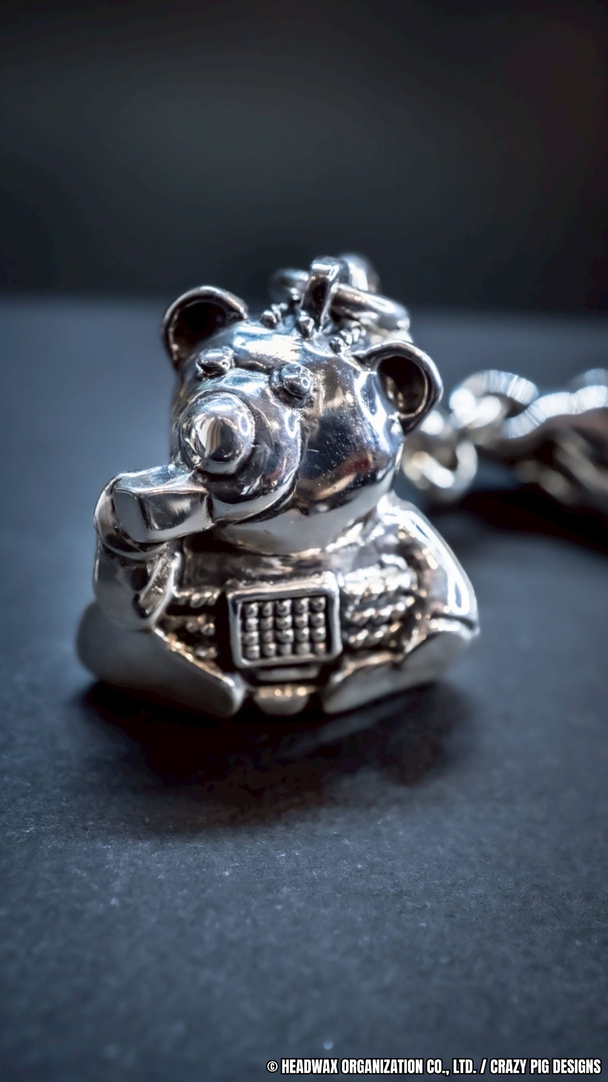 hide x CRAZY PIG DESIGNS待望のコラボレーション第3弾は、hideが生み出したアイコニックでユニークなサイコベアをモチーフに、CRAZY PIG DESIGNSの創業者であり、現在も唯一人のデザイナーを務めるアーマンド・セラがスターリングシルバーの重厚な質感を存分に活かしたキーリングです。
