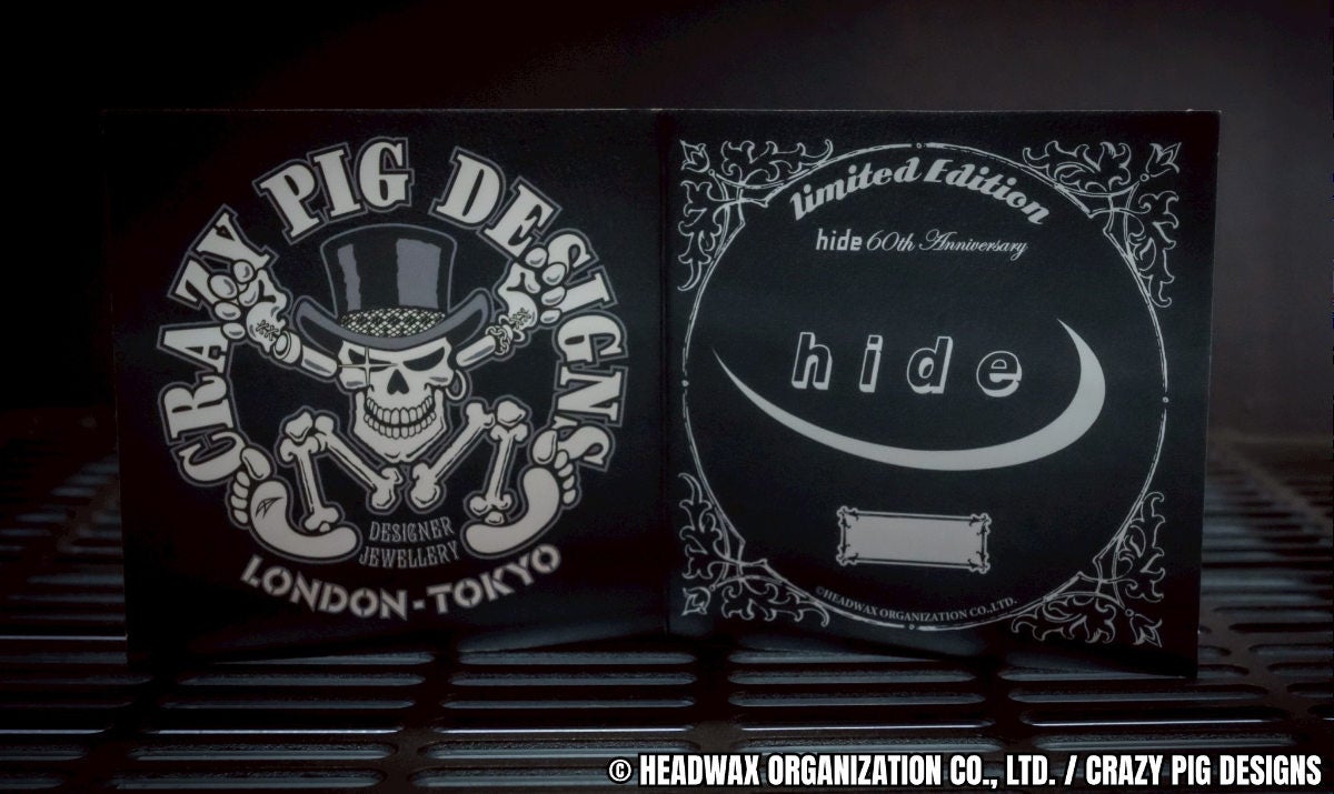 hideとCRAZY PIG DESIGNSのロゴ入り特製ジュエリーボックスとシリアル番号を記入した二つ折りカードが付属します。