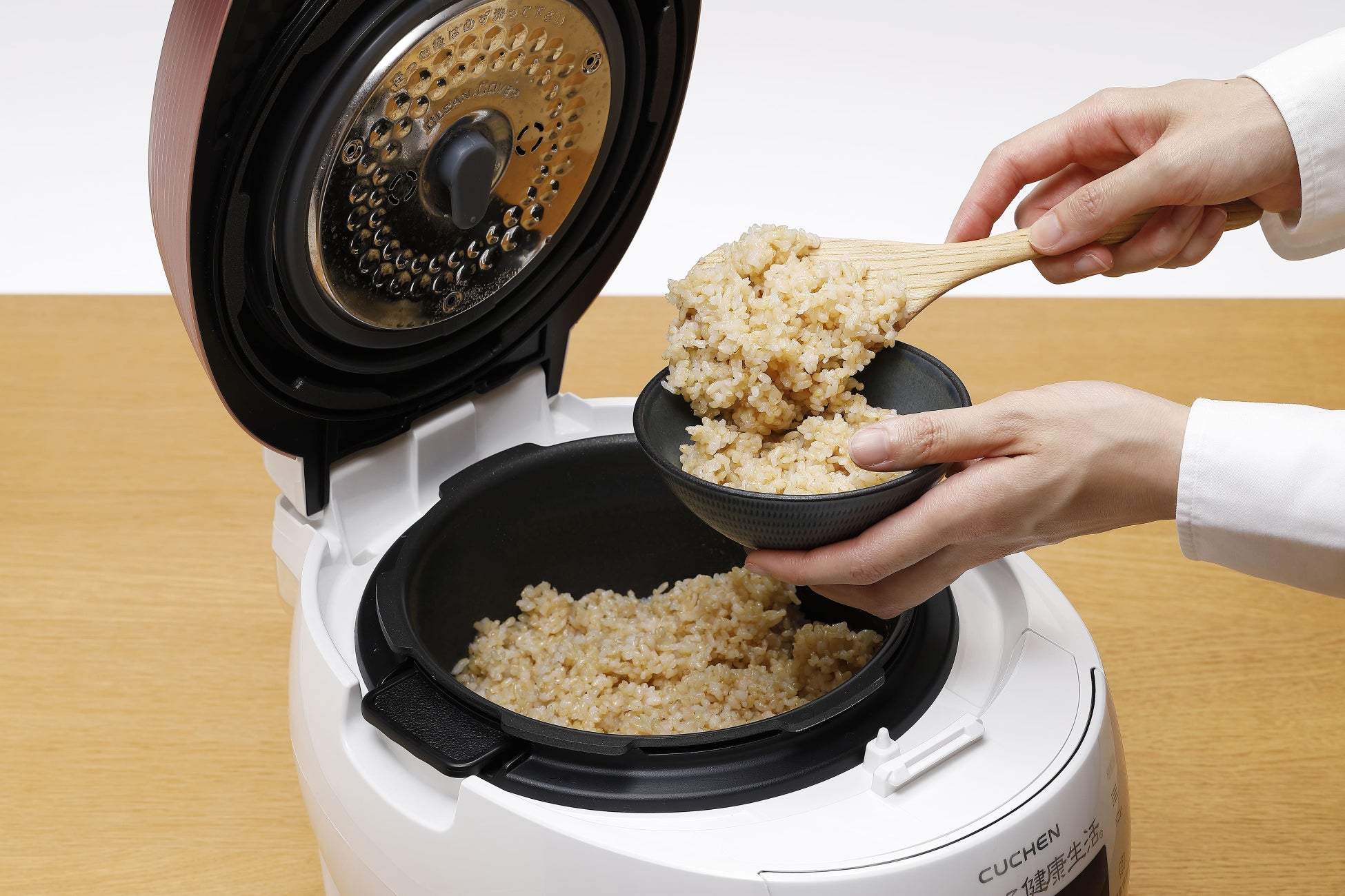 S字カーブの内釜が米を対流させることで芯まで均一に熱が伝わり、ムラなくおいしく炊き上がり、発芽したての玄米を食べることができます。発芽していない玄米に比べ、発芽玄米の方が栄養価が高くなります。柔らかく消化吸収がよいのもポイントです。