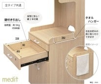 上部にスライド天板、鍵付き引出し、左右付け替え可能なタオルハンガー(1個)を標準装備し、中段には配線用の切り欠きを設け、ポットや小型テレビ、モニターの設置にも対応します。