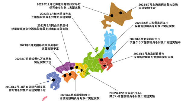 (図1 株式会社りらいぶと全国の自治体で行った過去の実績と今後の実証実験予定)
